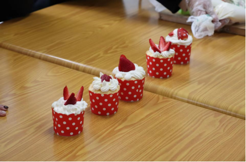 活动伊始,制作现场已经进行温馨布置:新鲜圆形戚风蛋糕胚、打发好的奶油、新鲜水果等一一摆放在大家面前。老师们亲自动手参与蛋糕制作,将烤好的圆形戚风蛋糕胚横切,装饰鲜奶油,将新鲜的草莓均匀摆在蛋糕顶部,做出自己喜欢的多变造型。