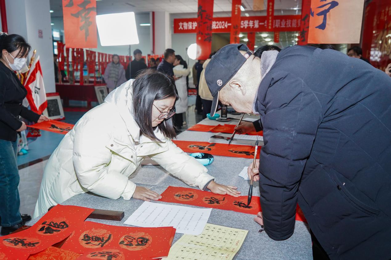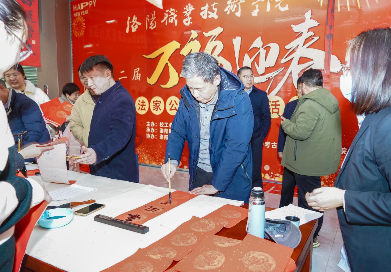 赵健亲自提笔书写“福”字,祝福学校快速发展,师生幸福。李保安与现场书法家进行了亲切交流,鼓励他们创作更多优秀的书法作品。活动现场热闹非凡、一派喜庆祥和,一幅幅红彤彤的春联、一张张喜庆的“福”字,表达了学校对广大师生的新年祝福和对即将到来的农历春节的美好祝愿。